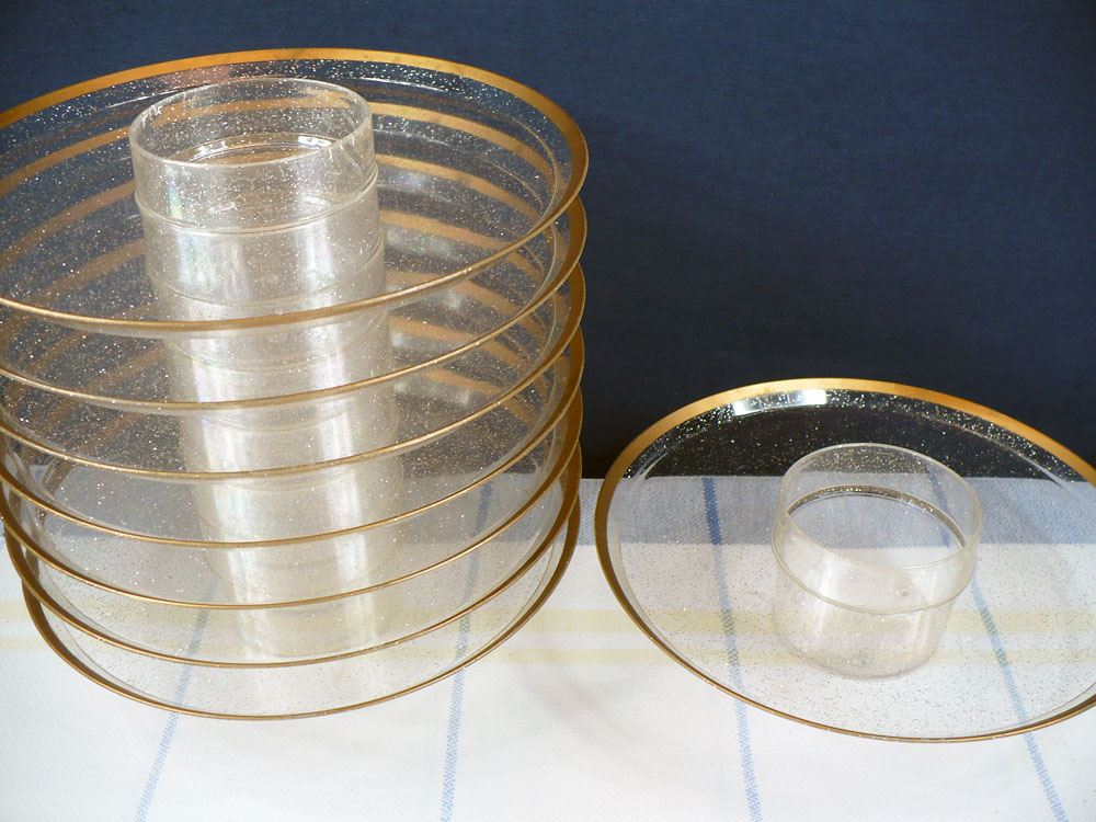 Vintage Plastic Gold Glitter Round Snack Tray Set