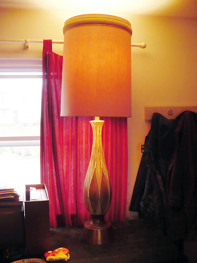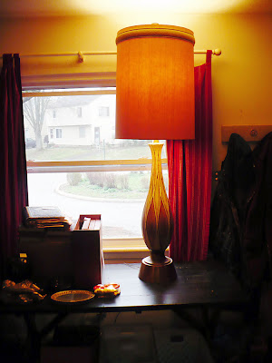It is the world's largest vintage table lamp. No, really - the thing is a full 60" (5 feet!) tall from the bottom to the top of the shade. The body is ceramic, and there is a glass globe that the shade sits on. (The shade itself measures a whopping 19" across and 25" tall!) I wish I could have gotten a better photo of it, but the light in my office is terrible - hence my decision to bid on the world's largest table lamp. It does help quite a bit - and it has a 3-way switch so if I don't want it full on I can tone it down a bit.