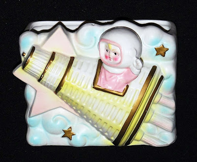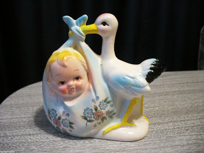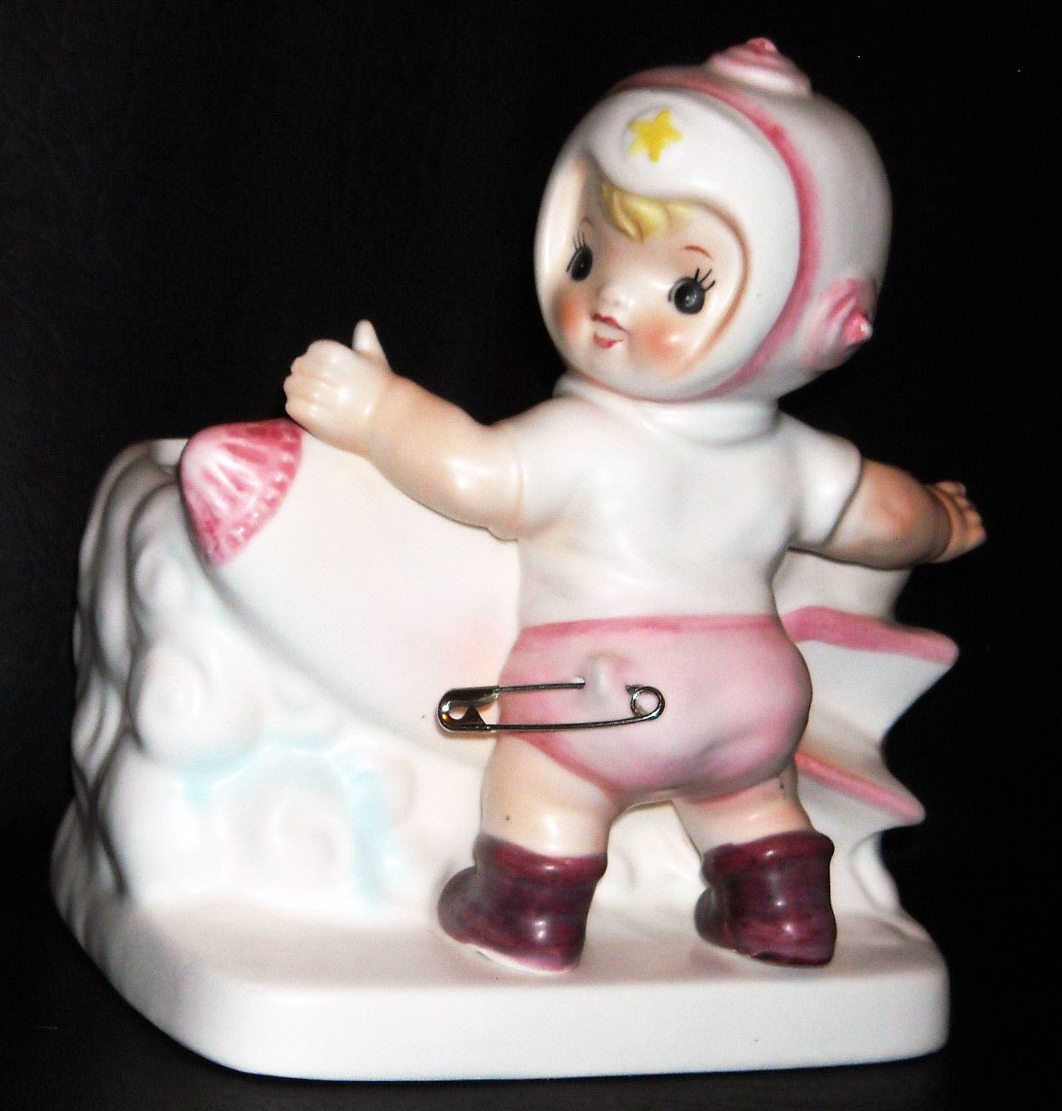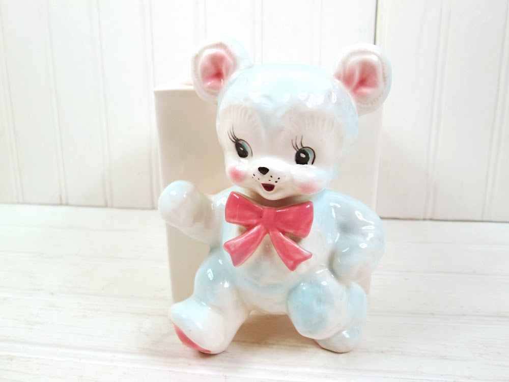 Every once in a while I run across a really cute vintage ceramic planter that was designed to be used in a baby's nursery - I don't think this is a universally popular thing to have in modern nurseries, but apparently back in the day it was quite the trend! There are tons of different styles, and it seems like most of them were made in Japan by companies like Napco, Relpo, Reubens, and others. I just listed this cute teddy bear one by Inarco in my Etsy shop the other day: